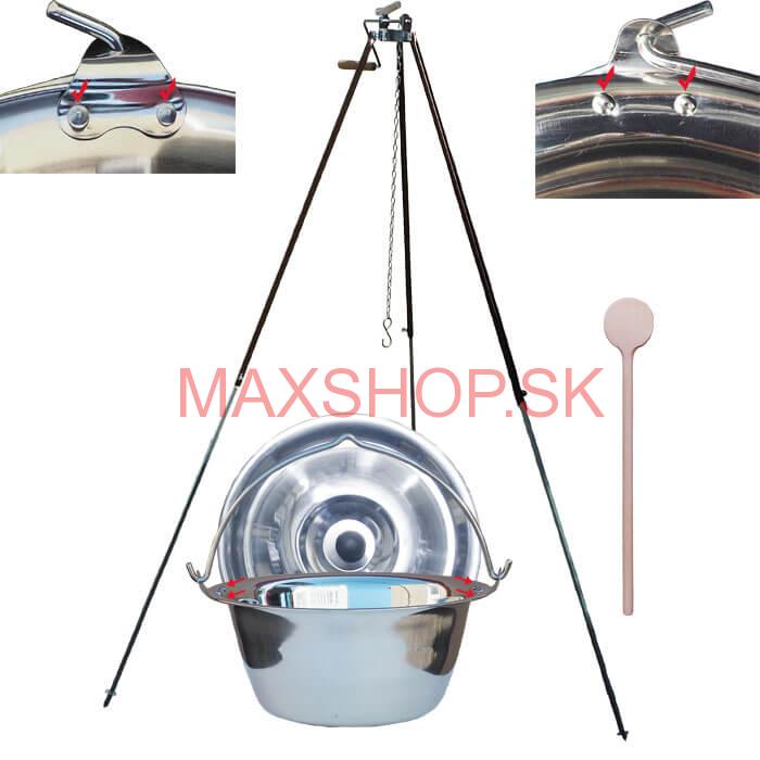 - Antikorový kotlík 15 L (0,8 mm) s nitmi + teleskopická trojnožka s poistnou kladkou + pokrievka