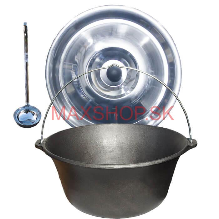 Liatinový kotlík 22 L + antikorová pokrievka   Obsahuje: Liatinový kotlik. Objem: 22 L. Materiál: hrubostenná liatina, nerezová rukoväť. Veľkosť: 49 cm, výška: 21,5 cm.   Antikorová pokrievka Veľkosť:  Vrchný priemer: 46 cm. Materiál: nerez INOX (antikor).   Kvalitná nerezová naberačka. Materiál: ne... celý popis