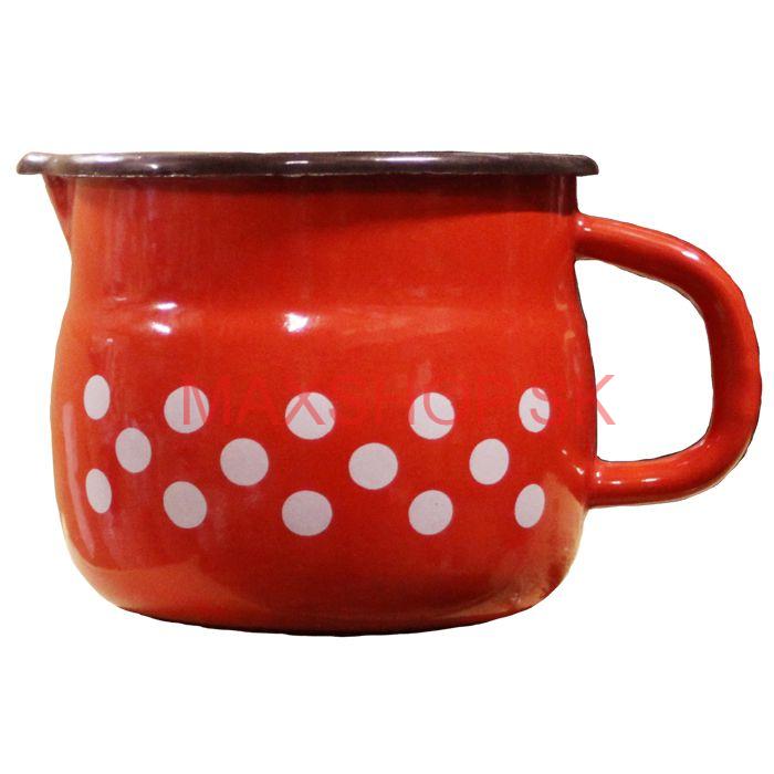 Smaltovaný hrnček s výlevkou. Materiál: smalt. Farba: červená, biele bodky. Objem: 1,5 L
